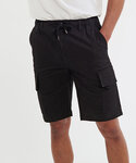 Two swings pockets and two back bellowed pockets with hook and loop fastening. Bellowed pockets to either leg with tab detailing and hook and loop fastening. Detailing to either leg under pockets. Elasticated waistband with drawstrings and gunmetal ends. Zip fly and button fastening to the front. Soft finish fabric. Belt loops.