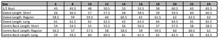 Centre back length at size 12R = 58cm