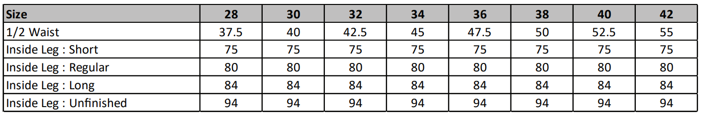 Slim fit, flat front, side pockets, twin hip jett pockets with button, telephone pocket, stretch waistband