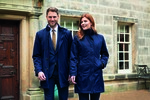 5 button fly front with zip, showerproof, centre vent, 2 outer welt pockets, quilted lining with 2 internal pockets, collar incorporating concealed hood, cuff with tab detail, front princess seams.