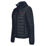 Polyester padding and lining. Warm and ultra-lightweight. Grown on hood with contrast lining, navy has self colour. Bound hood, cuffs and hem. Full length low profile zip with inner zip guard. Two front zip pockets. Packs away into storage bag.