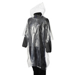 Foldable plastic poncho with attached hood, packed in a transparent polybag.