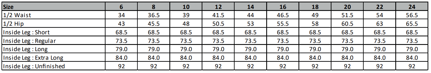 Tailored leg, front hook fastening, 2 side pockets, mock rear pockets, belt loops