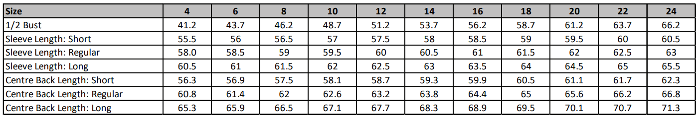 Centre back length at size 12R = 63cm