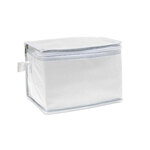 Cooler bag for 6 cans. Outside in nonwoven with white trimmings. 80 gr/m². Isolation material: foam laminated with aluminium foil. Capacity 3L.