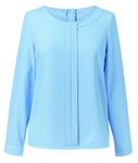 Long sleeve ladies' blouse, round neck, front pleat detail, bust darts, single gold button cuff, rear gold zip detail, easy care - machine washable at 30 degrees