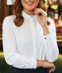 94% Polyester, 6% Elastane. Long sleeve ladies' blouse, with fly front & butoon detail, central back pleat, metallic button cuff easy care - machine washable at 30 degrees